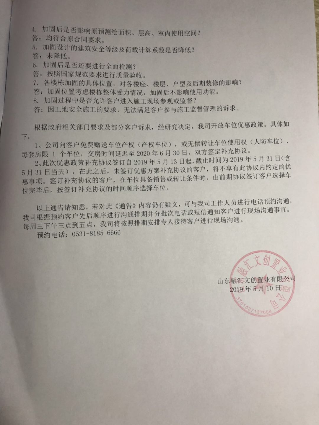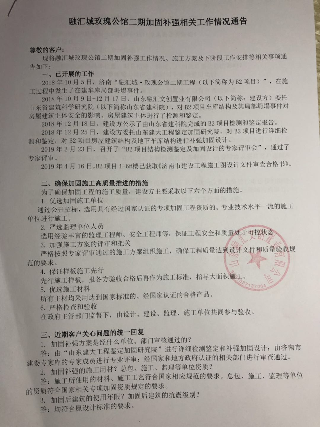 新京报快讯(记者 张建)今天(5月11日),济南融汇城玫瑰公馆二期购房者向新京报记者发来一份《融汇城玫瑰公馆二期加固补强相关工作情况通告》(以下简称通告)显示,存在建筑质量问题的融汇城玫瑰公馆将实施加固补强,并提及免费赠送客户车位产权。对此方案,部分业主表示拒绝接受。