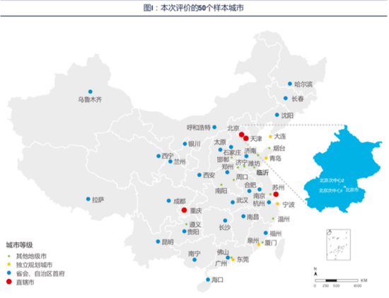 研究选取了包括直辖市、省会和地级市在内的50个城市,并按照城市日常生活中三大基本功能-居 住(Live)、就业(Work)和休闲(Play)选取了该三个要素最密集的核心区——“城市活力中心”(Live-Work-Play Centers)进行步行性评价。根据最具活力的71个城市活力中心内的12740条街道在9项步行环境指标的表现,为城市实际建成区内的每段街道计算出一个0~100的数值。