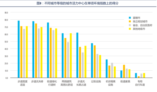 直辖市的城市活力中心在除了街道家具外的其他各单项得分都最高, 而在街道绿化/行道树、步道宽度适宜和步道无长期占道 三项指标的得分上明显高于其他城市