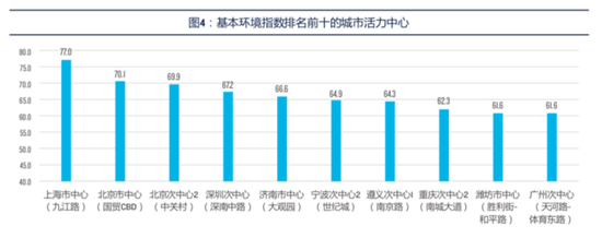 其中,过街设施、步道宽度适宜和步道无长期占道这3项衡量的是街道最基本的环境要素,即“是否有路可走”,被称为基本环境指数。对于这三项指标,报告给出了单独排名。其中,上海市中心、北京市中心得分超过 70分,特别是上海市中心的基本环境指数得分达到77.1 分,遥遥领先于其他城市活力中心。
