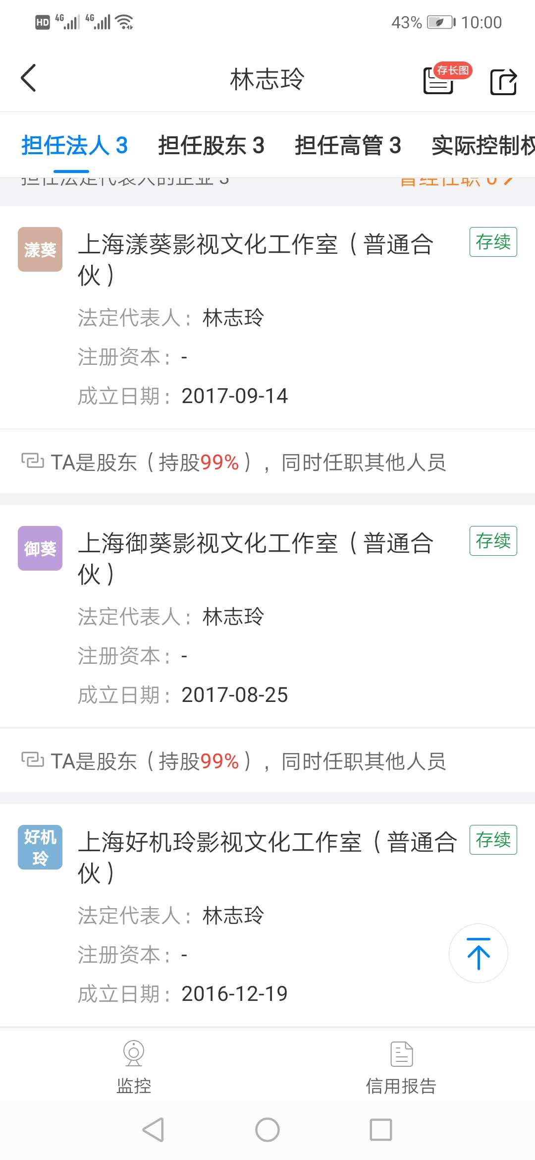 天眼查资料显示,林志玲名下有三家公司,分别是上海漾葵影视文化工作室(普通合伙)、上海御葵影视文化工作室(普通合伙)、上海好机玲影视文化工作室(普通合伙),林志玲均持股99%。