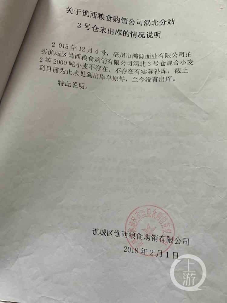 由谯西粮库于2018年2月1日出具的一份《关于谯西粮食粮食购销公司涡北分站3号仓未出库的情况说明》提到,“2015年12月4日,鸿源面业公司拍买谯西粮库涡北3号仓混合小麦2等2000吨不存在,不存在有实际补库,截至到目前(2018年2月1日)为止未见到出库单原件,至今没有出库。”这证实了此次交易只是一次虚假的补库交易。