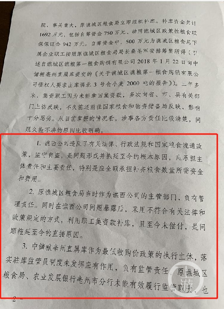 上游新闻记者了解,对于多部门事后联合补库试图掩盖盗卖真相的相关责任,《亏库函》指出,原谯城区粮食局作为主管部门负有管理责任,在谯西公司问题暴露后,采用不符合有关法律和政策规定的方式,利用职工集资款补库,是问题拖延至今(2019年4月)的直接原因。