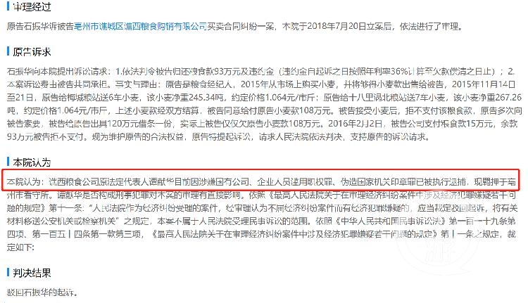 因谭献华涉嫌刑事犯罪,多名粮食经纪人的诉讼请求被驳回。