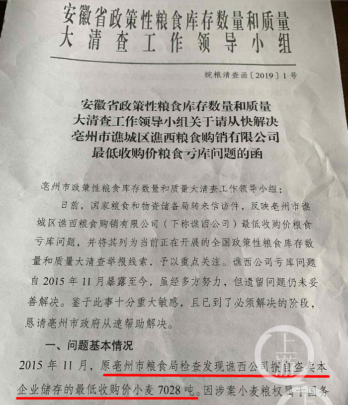 上游新闻记者获得了一份《关于请从快解决亳州市谯城区谯西粮食购销有限公司最低收购价粮食亏库问题的函》(以下简称《亏库函》)。这份红头文件是由安徽省政策性粮食库存数量和质量大清查工作领导小组,于2019年4月3日下发给亳州市政策性粮食库存数量和质量大清查工作领导小组的,其中明确点明了该粮库擅自盗卖国家储备粮的事实。