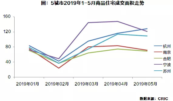 就2019年市场变化来看,5城走势相近,宁波表现抢眼,3-4月份成交放量,月度成交面积接近150万平方米,较其他4市高几乎翻倍。值得注意的是,三、四月份楼市小阳春过后,除杭州以外的4个城市均有不同幅度的下行,仅剩杭州商品住宅销售持续上行。