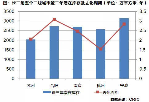 宁波由于土地供应的绝对值较高,潜在库存仍然最多,超过3000万平方米;其次合肥、南京和杭州的潜在库存都在2500平方米左右,值得一提的是杭州3年成交经营性用地总量仅次于宁波,但潜在库存量仅仅比苏州高,说明杭州土地——项目——销售的周转速度相对较快,而这些潜在存量的去化周期仅仅需要1.5年;苏州潜在库存则仅有2000万平方米,以近三年的成交体量来看2年即可去化完成。