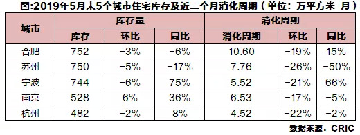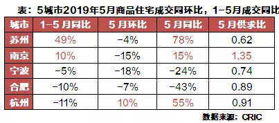 从前五月成交面积同环比来看,仅有苏州、南京2019年前五月成交量同比分别上涨49%和10%,杭州、合肥、宁波同比均出现不同程度下滑,其中合肥、杭州跌幅在10%以上。