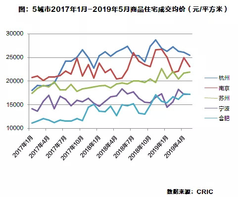 宁波、合肥房价相对较低,但合肥房价整体涨势强烈,2019年5月已经达到17303元/平方米,较2018年1月上涨26%,已于宁波相持平。