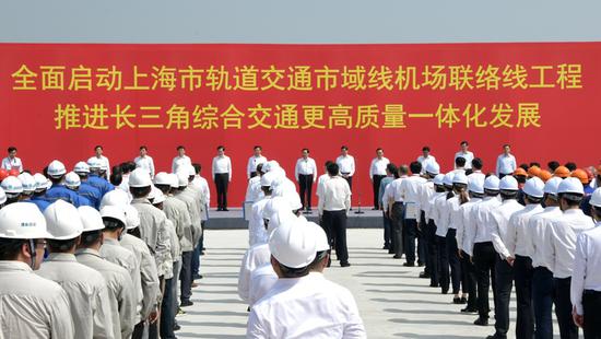 “全面启动上海市轨道交通市域线机场联络线工程、推进长三角综合交通更高质量一体化发展”活动今天上午举行。机场联络线这一重大交通工程、民生工程开工建设,标志着上海市域线网络建设进入新阶段,将进一步增强浦东和虹桥综合交通枢纽对长三角的服务功能。市委书记李强宣布上海市轨道交通市域线机场联络线工程开工,市委副书记、市长应勇讲话。