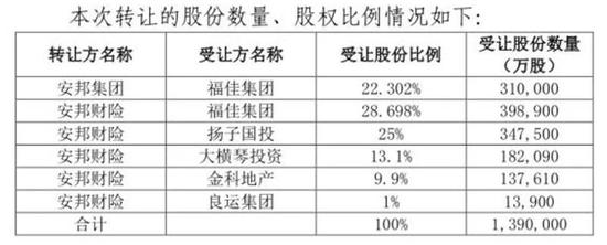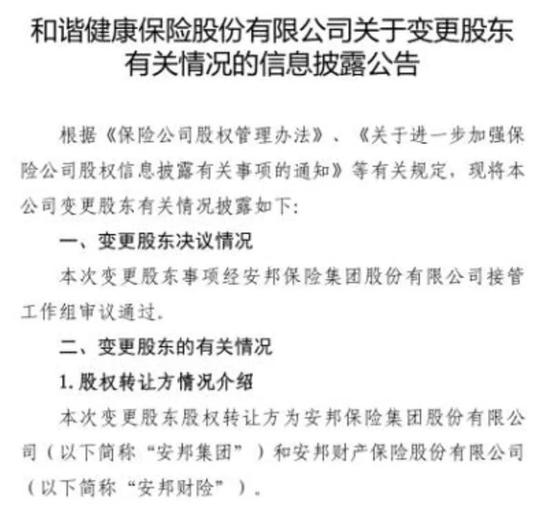 |   在距离解除接管只剩下7个月的当口,安邦保险集团的资产处置进入关键阶段。继前期出清世纪证券、邦银金租等非主业资产后,安邦集团接管组开始为旗下保险业务找买家。   7月4日,中国保险行业协会披露《和谐健康保险股份有限公司关于变更股东有关情况的信息披露公告》。这是安邦集团接管工作组接管以来,明确处理的第一笔安邦旗下保险资产。   五家非金融类企业露脸,拟携手吃下“安邦系”持有的和谐健康保险100%股权。其中,大连民营地产商福佳集团将以51%的持股权,成为和谐健康保险的最大单一股东。这印证了此前安邦集团接管组公告的“将保持安邦集团民营性质不变”。   安邦首家保险子公司转让   自接管以来,安邦集团相继对旗下非保险资产逐一处置。和谐健康保险是安邦集团处置的第一家保险子公司。   在转让前,和谐健康保险的股东有两家,安邦集团和安邦集团旗下的安邦财险,持股比例分别为22.302%、77.698%。   从公告来看,此次“安邦系”打算出清所有和谐健康保险股权。   拟接盘的股东有5家:福佳集团有限公司、南京扬子国资投资集团有限责任公司、珠海大横琴投资有限公司、金科地产集团股份有限公司、良运集团有限公司。   一旦交易成功,这5家公司将分别持有和谐健康保险51%、25%、13.1%、9.9%、1%的股权。  大连民营地产商浮出水面  业内好奇的是,有望成为和谐健康保险最大单一股东的福佳集团,是怎样的一家公司?   根据公告披露,或将成为和谐健康保险大股东的福佳集团的基本情况是:成立于2000年,注册资本50亿元,注册地在辽宁大连。   另据福佳集团官网资料显示,该集团是一家总部位于辽宁的民营企业,现已发展成为集石油化工、地产开发、商业运营、金融投资、贸易经营、物业管理、酒店服务于一体的多元化现代企业集团。未来,将以石化、地产、金融、商业、物业,多产业布局为核心开拓发展。   2017年该集团实现销售收入390亿元,截至2018年已连续九年入围中国500强企业。   这并非福佳集团第一次染指保险股权。   福佳集团“孙子”公司大连机车商业城(8.030, 0.00, 0.00%)有限公司(天眼查信息显示,现更名为福佳商业管理有限公司)曾作为主要发起人之一,递交了筹建福康人寿的申请。但2016年底因经营定位不明确等三个原因,原中国保监会驳回了福康人寿的筹建申请。   公告显示,此次变更股东事项经安邦集团接管工作组审议通过,但仍需等银保监会批准后才生效。   此次受让股权方的5家公司均承诺:公司严格按照国家法律法规及相关监管要求,投资和谐健康保险的资金均来源于合法的自有资金,无任何委托资金、债务资金等自有资金,也未接受他人委托持有投资和谐健康保险的股份。   此外,5家公司也均声明:公司及公司实际控制人与和谐健康保险现有股东及此次拟投资和谐健康保险的其他投资人之间不存在任何关联关系、一致行动,也不存在股权代持或其他安排。   延伸阅读   安邦集团资产处置历程   2018年2月23日   原中国保监会发布公告,决定对安邦集团实施接管。接管期限自2018年2月23日起至2019年2月22日止。   2018年3月28日 |