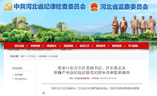 7月4日晚上8点50分左右,河北省纪委监委网站消息,张家口市万全区委副书记、区长张志友涉嫌严重违纪违法,目前正接受纪律审查和监察调查。