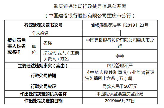 建设银行重庆市分行被罚50万:同业业务内控管理不严