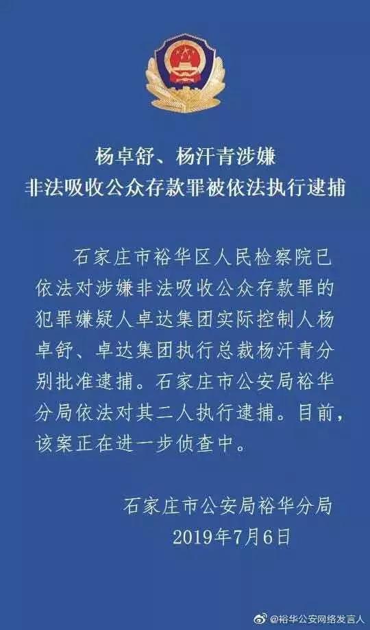 |   来源:深蓝财经   昨日一则实控人被批逮的消息,让这家名为“卓达”的大型民营地产公司引起了网民的广泛关注。   一起庞式骗局,一位河北前首富,两者之间存在着何种联系?现净资产逾千亿元的房地产企业,又为何在近几年频频推出理财产品?   这些“诡异”的疑点亟待解答。   涉嫌非法吸收公众存款罪   卓达集团实控人被批逮   7月6日下午,“裕华公安网络发言人”发布消息称,卓达集团实际控制人杨卓舒,执行总裁杨汗青分别被批准逮捕,全文如下:   此前的5月18日,石家庄裕华公安分局微博曾发布警情通报称,卓达集团实际控制人杨卓舒、杨汗青向公安机关主动投案。公安机关已依法对杨卓舒、杨汗青等人涉嫌非法吸收公众存款案立案侦查,并对杨卓舒、杨汗青等主要犯罪嫌疑人采取了刑事强制措施。   据企查查显示,从2018年2月起,卓达集团24次被列为被执行人,此外还有7起股权冻结,涉及金额约9个亿。   公开资料显示,卓达集团全名为卓达房地产集团有限公司,是河北地区的地产开发商巨头。公司创建于1993年7月,现净资产超过千亿元。在2019中国房地产企业500强排行榜中,卓达房地产集团有限公司仍榜上有名,排在第349位。深蓝财经发现,目前卓达集团的官网已无法打开。   现年67岁的杨卓舒是卓达集团的董事长兼总裁,杨汗青是杨卓舒之子。  图/杨卓舒  资料显示,1993年,杨卓舒放弃《石家庄日报》发行处副处长的职务,转身下海,通过“空手”炒楼盘完成了最初的资本积累,创建了卓达集团。凭借着在老东家《石家庄日报》打下的良好媒体关系,杨卓舒赊下一整版广告:“卓达别墅每平方米1588元!”   在当时,这个价格可是比一般商品房还低400多块钱,何况还是别墅。消息一出,迅速在石家庄传播。“没有福利分房了,到卓达花园享受福利物业。”这是卓达花园响彻石家庄的一句宣传口号。其实行的福利半福利收费模式,即乘车、开水、环卫、绿化、一般维修等60项全部免费服务,水、电、暖三费低于国家标准的5%—15%,效果出奇制胜的好。一时间,手提现金的购房队伍排得车水马龙。不到1个月的时间里,杨卓舒一次性集资4600多万元。   从2001到2003年,杨卓舒连续3年蝉联《福布斯》河北首富。   可好好的河北首富为什么在近几年调转方向,开始朝着庞氏骗局的路数狂奔呢?通过对媒体报道的梳理发现,杨卓舒所操盘的庞氏骗局,还是离不开他的老本行地产,只不过沦为了用来融资的工具。   非法集资,全靠演技   2015年无界新闻就曾以《卓达新材百亿融资术:30%高息吸引40万人》,曝光了卓达集团30%高息融资骗局。据无界新闻报道,卓达集团将地产项目包装成理财项目,通过售卖20~30%超高收益率的理财产品,吸引了众多投资者。   2015年12月无界新闻报道时,上线一年多的卓达新材理财项目,就已经有40多万的百姓卷入,这些人每人集资5万元起,七成以上为石家庄本地居民,以老年人居多。   从多家媒体报道来看,卓达集团于2014年上半年开始便通过卓达新材理财项目接受公众投资。据公开报道及网络爆料,卓达新材理财项目收益率高达20-30%。卓达的宣传中,投资卓达新材,不仅有现金回报,还可获得上市公司股份。   投资额5万元起,收益率最低为28%。投资100万可以得到22%的利息,以及2%的配股,如果最终不能上市,最终投资者将拿到32%的利息。投资500万以上,收益率则更是高达34%。   如此高的收益率,引来了不少质疑,毕竟国内的正规金融机构最多也只能给出12%左右的年收益峰值。   据了解,有不少投资人认为虽然购买的高收益理财产品虽然可能会有风险,但他们还是选择相信卓达集团的名头。卓达在全国各地都有产业布局,万一兑现不了,还有房子可以保底。   卓达集团要拿什么来支付这高额利息,要盖多少房子才能回报投资者?正常的生意显然无以为继。不过卓达集团一早就打定主意,通过新项目新投资者来不断填坑。   为了增加理财项目可信度,卓达官网还编出了一系列虚假业绩来诓骗投资者,“卓达新材已收获逾2万亿元(RMB)订单”、“2016年,卓达新材集团将实现产能20亿建筑平米,可实现市场销售总额7万亿”……   但面对非法集资的质疑,杨卓舒曾在2015年一口咬定:卓达的民间融资行为属于响应国家号召的金融创新,绝对不会出现兑付问题。   虽然董事长在斩钉截铁的保证,但实际上卓达集团还在演。   实际上,自2016年开始,卓达的理财出现了大面积延期兑付的问题。为了“安慰”投资者,卓达集团屡屡发公告称: