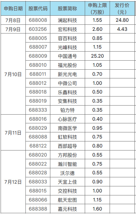 |  科创板渐行渐近,新股申购狂潮就此开启。   下周(7月8日至7月12日),将有22只沪市新股进行网上网下申购,其中21只为科创板新股。每天都有新股可以打,而且周三将迎来前所未有的“扎堆打新日”,9只科创板新股在同一天进行打新。   如何参与这场难得的打新盛宴?请投资者收好澎湃新闻记者梳理的这份打新指南。   具体来看,7月8日周一,澜起科技(688008)申购。   7月9日周二,沪市主板新股宏和科技(603256)申购,这也是下周唯一一家非科创板上市的新股。   7月10日周三,9只科创板新股集体打新,沪市一天9只新股申购的情况,还是有史以来的头一回。   在这9只新股中,拟募资规模高达105亿元的中国通号(688009)在列,按照同等募资额的新股历史中签率计算,顶格申购几乎肯定可以中签,但顶格申购的门槛相当高,需配市值252万元。   7月11日周四,西部超导等4只科创板新股申购。   7月12日周五,交控科技等7只科创板新股申购。   目前,21家科创板新股中,仅澜起科技公布了发行价格信息。   据公告披露,在网下投资者初步询价阶段,剔除无效报价和最高报价后,参与初步询价的投资者为191家,配售对象为1758个,整体申购倍数为244.06倍。   经过询价确定的发行价为24.80元,扣非后市盈率40.12倍,单一账户申购上限为1.55万股,顶格申购需配市值15.5万元。   澜起科技本次发行股份数量为1.13亿股,占发行后公司股份总数的10.00%,全部为公开发行新股。网上网下回拨机制启动前,网上初始发行数量占扣除最终战略配售数量后发行数量的20.00%。   此外,在22只新股中,顶格申购门槛最高的是上文提到的中国通号,顶格申购需配市值252万元。不过,其他新股的顶格申购门槛并不算太高,沪市主板新股宏和科技为26万元位列第二,科创板新股中,除中国通号外门槛最高的是嘉元科技(688388),将在7月12日进行申购,顶格申购需配市值16万元。门槛最低的则是将在7月10日打新的安集科技(688019)和铂力特(688333),仅需3.5万元沪市市值即可顶格申购。   截至发稿时间,已经有4只科创板新股完成申购流程,并公布了中签结果。这4只新股分别是华兴源创(688001)、睿创微纳(688002)、天准科技(688003)、杭可科技(688006),中签率水平基本一致,在0.055%至0.061%之间。   随着科创板IPO企业密集开启打新,科创板股票交易的正式启动也已经进入最后倒计时阶段。   7月5日晚间,上海证券交易所发布《关于科创板首批公司上市安排的答记者问》,宣布科创板首批公司上市的条件基本具备,时机已经成熟,将于7月22日(周一)举行科创板首批公司上市仪式。   截至发文时间,已有25家公司获得证监会同意注册的批复,系科创板首批挂牌上市公司。即将在7月8日至7月12日之间开放打新的这21只科创板新股,都在首批挂牌企业之列。   澎湃新闻记者梳理出了投资者在参与科创板新股打新时,需要特别注意的四大事项。   第一,打新是根据投资者持有的市值确定其网上可申购额度的。持有市值1万元及以上的投资者才能参与新股申购,每5000元市值可申购一个申购单位,不足5000元的部分不计入申购额度。每一个申购单位为500股,申购数量应当为500股或其整数倍,但最高不得超过网上初始发行股数的千分之一。   第二,下周三、四、五都将出现同一天多只科创板新股申购,在这种情形下,在进行市值计算时,不需要重复计算,持有市值可同时用于申购多只新股。   第三,根据要求,投资者参与网上公开发行股票的申购,只能使用一个证券账户。同一投资者使用多个证券账户参与同一只新股申购的,以及投资者使用同一证券账户多次参与同一只新股申购的,以该投资者的第一笔申购为有效申购,其余申购均为无效申购。   第四,投资者应谨防“弃坑”情况出现。根据规则,网上投资者连续12个月内累计出现3次中签后未足额缴款的情形时,自结算参与人最近一次申报其放弃认购的次日起6个月(按180个自然日计算,含次日)内不得参与新股、存托凭证、可转换公司债券、可交换公司债券网上申购。   以下是下周22只新股申购的具体信息: