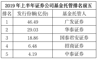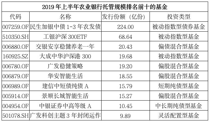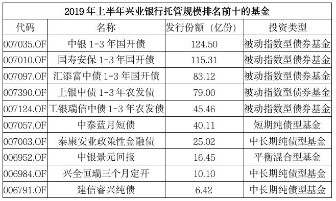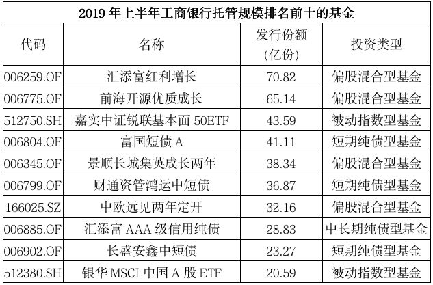 |   来源:中国基金报   2019年上半年新发基金托管榜单尘埃落定,工商银行(5.670, -0.01,-0.18%)继续“霸榜”,“黑马”兴业银行(18.270, -0.02, -0.11%)、农业银行(3.650, -0.01, -0.27%)跻身前三,招商银行(36.470, 0.39,1.08%)及建设银行(7.540, 0.04, 0.53%)也挤入前五。   兴业银行农业银行跻身前三   年初的权益类基金,年中的科创主题基金加上频现首发百亿规模的债券指数基金,基金市场不断涌现的热点,带动各大银行基金托管业务节节攀升。   Wind数据显示,今年以来,截至6月30日,27家银行及券商机构合计托管新发基金规模达到4813.15亿元,同比增长8.85%。其中,工商银行、兴业银行、农业银行托管的新基金募集规模分别为719.77亿元、576.24亿元、563.95元,工商银行优势明显。   工商银行去年年中新发基金托管半程冠军被招商银行反超,下半年强势发力,年终重回第一,今年上半年依旧领跑。数据显示,工商银行今年上半年新增托管基金达到70只,无论是科创主题3年封闭运作、中日互通基金、养老目标基金,还是爆款权益类基金背后均有工商银行托管的身影。   从存量基金托管规模上看,工商银行、建设银行、中国银行(3.750,-0.02, -0.53%)分列前三,剔除货币及短期理财基金,工商银行托管存量基金规模已突破万亿。   兴业银行、农业银行上半年新发基金托管规模增长势头强劲,其中,兴业银行今年新托管的中银1-3年国开债、国寿安保1-3年国开债指数基金首发规模突破百亿大关,汇添富中债1-3年国开债、上银中债1-3年农发债首发规模也在80亿元附近;农业银行上半年托管基金中,仅民生加银中债1-3年农发债一只基金首发规模就超过200亿元。   “兴业银行在债券指数基金上的托管优势来自它的金融市场同业平台,兴业银行能够利用这一优势给债券指数基金销售找到很多机构客户资源,给基金发行带来增量,基金公司在给这类基金寻找托管行时也会比较看重这一因素。”一家基金公司负责销售业务的人士透露。   “债券指数基金中的机构客户占比较高,成立户数也不会特别高,一般在两、三百户左右。很多债券指数基金托管在兴业银行,也是希望借助兴业银行的金融机构资源优势。”另一位基金公司市场总监分析。   在多位业内人士看来,招商银行整体实力依旧。“招商银行一直比较重视权益类公募基金销售,兴业、浦发等股份制银行则在机构业务上更为积极。”上述几家公司负责销售业务的人士称。   “招商银行的特色还是权益类基金销售,今年上半年托管及主代销的睿远成长价值混合基金以及多只科创主题3年封闭运作基金,招商银行销售实力非常突出,只不过最后通过比例配售控制首发规模。”另一位基金公司人士也如是评价。   “对于很多优秀的财富管理银行而言,本行托管是基金销售的加分项,但不是决定因素。一些优秀基金经理管理的基金,他们都会纳入重点销售名单。因此,不能把托管规模与基金销售完全划上等号。”上述基金公司市场总监称。   券商机构基金托管规模仍小   上半年5家券商合计新增基金托管规模105.05万元,广发、华泰、国泰君安(18.030, -0.20, -1.10%)排名前三,新发基金托管规模分别为46.49万元、29.03万元、18.86万元。
