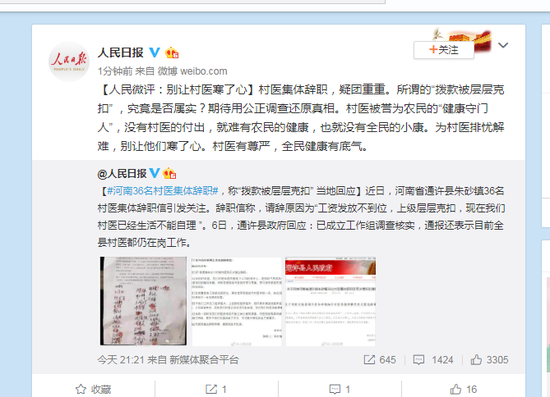 疑拨款被扣村医集体辞职 人民日报:别让村医寒心
