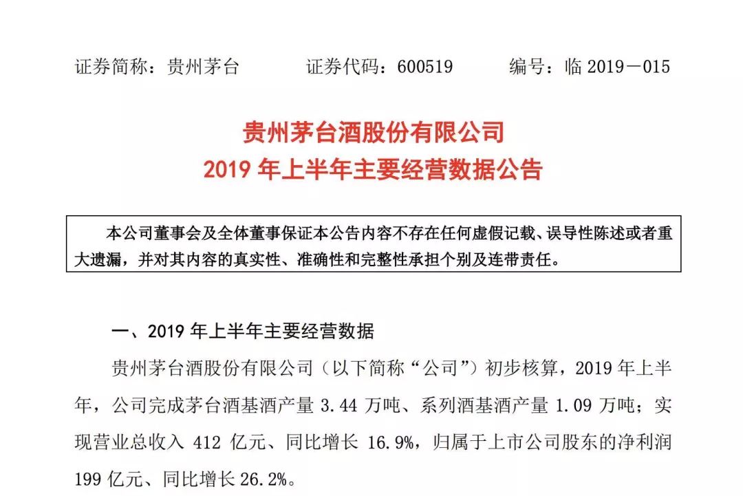 |   7月12日晚间,贵州茅台发布了上半年主要经营数据,实现营业总收入412亿元,同比增长16.9%,距离实现贵州茅台大股东茅台集团2019年的“千亿”目标可期。   净利润方面,上半年实现净利润199亿元,同比增长26.2%,可以说,贵州茅台今年上半年日均净赚约1.1亿元。   股价表现方面,今年以来贵州茅台累计上涨71.35%(前复权),远超大部分个股同期表现,股价更是一度涨破千元,最高触及1035.60元/股。   无论是经营业绩,还是在二级市场的价格表现,贵州茅台都做到了稳步上涨。市场对贵州茅台的价格预期也是一楼高过一楼,近日东兴证券(11.520, -0.06, -0.52%)将贵州茅台目标价上调至1424元高位,这是目前市场给出的最高目标价。  贵州茅台年K线  二季度营收略降速   全年冲刺“千亿”目标   尽管贵州茅台上半年取得了不错的营收增速,不过部分投资者却还是不太满意的。   有投资者指出:“拆开来看,今年第二季度的营收和利润增速,略低于一季度,只能说一般。”   2019年一季报显示,贵州茅台实现营收216.44亿元,同比增长23.92%;净利112.21亿元,同比增长31.91%。对比来看,二季度增速有所放缓。   在年初的时候,董事长李保芳曾用一句话总结2019年的任务——奔着千亿干。   虽然二季度增速放缓,不过结合市场上的各方分析看,按照以往下半年销量情况,在多个重要节日助力下,是白酒等消费品的旺季,2019年贵州茅台千亿营收目标是可实现的。   需要注意的是,贵州茅台如果想持续保持高速增长,需要从提升价格或者产量入手,目前产能受限成为了贵州茅台高速发展的“绊脚石”。   茅台集团董事长李保芳在今年5月份的中国酒业峰会上指出:“根据现在测算的情况,很长一段时间里,茅台酒的产能差不多五万六千吨,还有六千六百吨的生产能力正在扩建,今年年底差不多可以完成。由于环境承载能力、上游的原材料以及赤水河的水等都不允许我们再扩建。”   目标价一路走高   券商高看至1424元   年初的时候,中金公司喊出了900元的目标价,不少投资者觉得是天方夜谭。   如今看来,就连今年3月底华创给出的1000元目标价,以及4月初太平洋(3.440, 0.00, 0.00%)证券给出的1030元目标价,也已全部实现。   近日,东兴证券发布研报表示,按照2020年EPS 47.45元计算,给予公司30倍估值,上调贵州茅台目标价至1424元,并维持公司“强烈推荐”投资评级。   东兴证券表示,首先,根据草根调研数据,茅台一批价近期已经站稳2000元,终端价格达到2400元左右。茅台批价的不断走强,主因是茅台酒的供不应求。在即将到来的中秋节,茅台酒价有望坚挺。   其次,公司在6月下旬启动经销商下半年打款计划,目前经销商打款已经全部完成,此部分将在公司中报预收账款中体现,届时公司全年业绩将提前锁定。 |