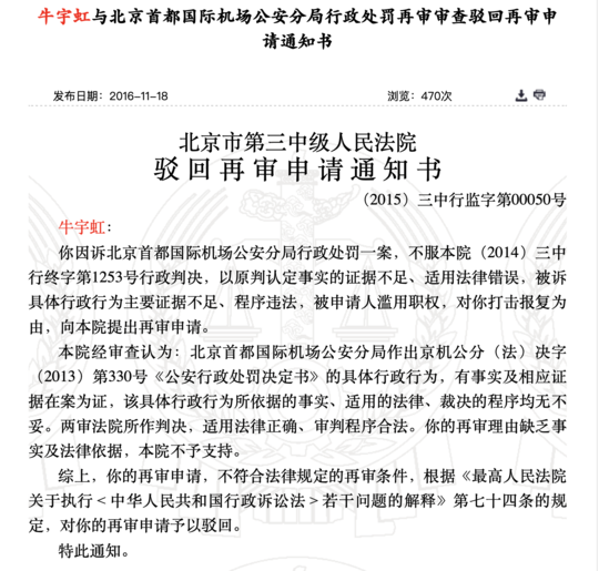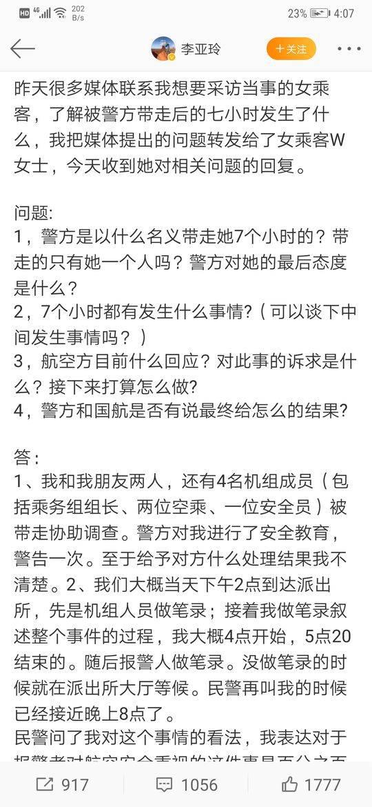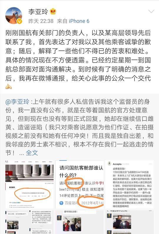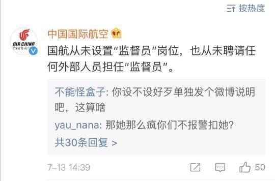 |  封面新闻记者 杨金祝   7月13日,微博认证为编剧的李亚玲发文称,7月12日,她乘坐国航CA4107次航班从成都前往北京时,一名自称是“国航监督员”的女性大声斥责同机乘客。最后,在这位监督员的电话举报下,几名乘客在下飞机后接受了警方调查,滞留了7个小时。   随后,@中国国际航空 在官方微博中回复称:国航从未设置“监督员”岗位,也从未聘请任何外部人员担任“监督员”。目前,该回复评论已经被删除。   7月13日晚间,李亚玲就“国航监督员事件”再发微博,称国航方面有关负责人及高层领导已先后联系自己,并表达歉意。但具体情况目前不方便透露,双方约定周一到国航总部面对面沟通解决。   目前,该事件已经引发广泛关注,这名“监督员”什么来头?国航究竟有无设置相关岗位?   李亚玲在微博公布了一篇“当事女乘客的回应”的文章   “国航监督员”斥责乘客并报警   相关旅客滞留7小时   李亚玲在微博中称,飞机刚滑出停机位时,有名女乘客正在打电话。在广播提醒关机后,该乘客将手机关机。而自称“国航监督员”的旅客在头等舱大声斥责其他旅客打电话和玩手机的行为,并要求机组人员在飞机降落后,把几个旅客带到机场公安局学习航空安全法。   随后,自称“国航监督员”的旅客继续斥责,要求机组人员提供相关旅客身份资料,同时拍摄相关旅客、要求机组报警并填写投诉表要求空乘签字。   飞机落地后,该名旅客拨打了电话报警,通知了机场警方,要求将同机的四名乘客“扣下来”。“ 没想到我下飞机时,机组接到了什么电话,要求我留下来配合调查,因为接我的司机已经在出口处等着了,我没理会,还是快步走了,但是另外几个旅客居然就真的被他们拦下,让警方带走了……”李亚玲表示,最后同行乘客告诉她,他们滞留机场7小时,配合警方的调查。   14日中午,李亚玲在微博公布了一篇“当事女乘客的回应”的文章。其中提到,“我和我朋友两人,还4名机组人员被带走协助调查。警方对我进行了安全教育,警告一次。至于给予对方什么处理结果我不清楚。”该乘客表示,7个小时的时间里,主要是在做笔录以及向警方谈对这件事的看法,警方建议双方见面调解。最后,她们与报警者进行了当面调解,“报警者此时已经不在像飞机上那么激动了,看起来平和了不少,又举了若干空难的例子。”   “国航监督员”到底是什么岗位?   国航已删除相关评论   事件中,李亚玲及当事乘客对“国航监督员”提出了质疑。李亚玲在微博中提到:国航监督员到底是个什么职位?有哪些法定权利?   13日下午,国航官方微博在其微博下评论表示,国航从未设置“监督员”岗位,也从未聘请任何外部人员担任“监督员”。但当天晚间,国航官方微博已经删除这条微博评论。   13日晚间,国航官方微博已经删除这条微博评论。   公开信息显示,民用航空行政执法人员称为中国民用航空监察员,简称“监察员”而非“监督员”。根据2005年5月3日起施行的《中国民用航空监察员规定》,监察员由民航总局颁发中国民用航空监察员证并实施监督管理。   从规定的职责权限来看,监察员可以在飞机上做出前文提到的“联系机场公安”、“要求乘客配合调查”等。   在一篇名为《国航力促全员服务提升》的文章中,有这样一句话:6月29日,他们以服务提升员工再动员的形式,推出新的服务举措,并邀请服务质量社会监督员,为促进服务提升共同努力。   同时,在民航资源网2007年发布的一篇文章称,当年7月26日,为答谢社会质量监督员的工作,国航股份西南分公司曾特地邀请14名社会质量监督员,在该公司飞行训练中心的波音737模拟机上亲身体验了一下“开飞机”的感觉。   2009年1月10日,国航西南分公司还在成都举办了一次高规格的“社会质量监督员新春答谢酒会”。   里面提到,“社会质量监督员制度从1994年开始实行,社监员每年从该公司常旅客中义务聘请,由他们不定期地对公司购票、地面服务和空中服务质量进行检查,用《服务质量监督表》的方式回馈。据统计,每年社监员向公司反馈有价值的服务质量调查表200余份,对提升公司服务质量起到了推动作用。另外,所有社会质量监督员也是公司知音卡的金卡和白金卡客户,和他们加强沟通有助于进一步增加优质客户对国航的认同。”   此外,记者发现,曾有网友在微博上晒过类似国航监督员的相关聘书。目前,国航暂未对此事件作出具体回应。  有网友在微博上晒过类似国航监督员的相关聘书  涉事女子确系国航员工   曾因辱警被拘   13日晚,李亚玲在微博再度发声,曝出自称“监督员”的女子是国航客舱服务部办公室的牛宇虹。并称,牛宇虹有多次类似事件记录。“这不是她第一次了,裁判文书网可以看到北京市第三中级人民法院的行政判决书(2014)三中行终字第1253号,显示此人曾因同样的事情大闹首都机场,被行政拘留5日”。李亚玲在微博中表示。   记者在裁判文书网上发现,上面的确有牛宇虹与北京首都国际机场公安分局行政处罚纠纷。   2015年2月11日发布的北京市第三中级人民法院驳回再审申请通知书(2015三中行监字第00050号)显示,牛宇虹诉北京首都国际机场公安分局行政处罚一案,不服(2014)三中行终字第1253号行政判决,以原判认定事实的证据不足、适用法律错误,被诉具体行政行为主要证据不足、程序违法,被申请人滥用职权,打击报