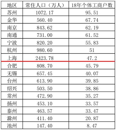 在上述榜单中,值得注意的是,上海地区个体工商户数量47.2万人,多于长三角地区的平均数量46万人,但由于常住人口远远多于其他城市,达到2423.78万,明显拉低了“老板”的比例,平均51人中才有一位“小老板”。