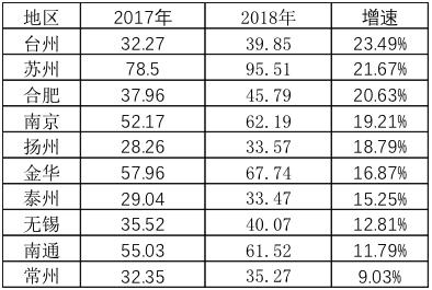 21世纪经济报道记者对各城市个体工商户增速进行了排序,从增速来看,浙江台州的老板数量增长最快,2018年的环比增速达到了23.49%。苏南城市群中的苏州和南京紧随其后,分别增长21.67%、19.21%。