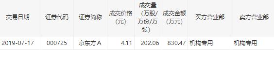 7月17日,京东方A发生1笔大宗交易,总成交数量为202.06万股,总成交金额830.47万元,成交价为4.11元/股,较当日收盘价溢价0.0%。买入方和卖出方均为机构。