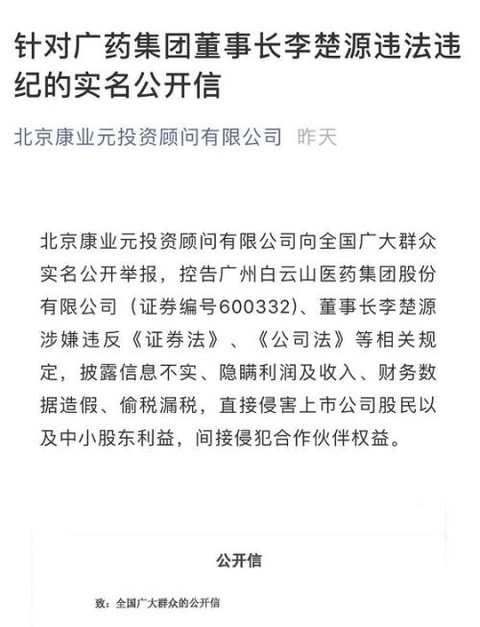 |  7月18日,一个认证名称为“北京康业元投资顾问有限公司(简称“康业元投资”)”微信公众号,发布一篇名为《针对广药集团董事长李楚源违法违纪的实名公开信》。文中称,白云山(38.660, -0.35, -0.90%)(600332,诊股)、李楚源涉嫌违反《证券法》、《公司法》等,存在披露信息不实、隐瞒利润及收入、财务数据造假、偷税漏税,侵害了股东利益、合作伙伴权益。   针对小股东发公开信举报白云山一事,广药集团7月19日声明称,关注到下属合资企业广州白云山医药科技有限公司另一股东康业元昨日发布的公开信。   经了解,白云山科技公司一直按照公司章程依法经营,康业元多次未履行董事和股东职责。   关于金戈的相关问题,白云山科技公司等一直主动与康业元进行协商,但未达成一致意见。公开信内容与事实严重不符,并造谣诋毁公司及董事长李楚源和科技公司总经理肖荣明,公司已向公安机关报案并获受理。   国产伟哥引发利益之争   7月18日,一个认证名称为“北京康业元投资顾问有限公司“的微信号发布了题为“针对广药集团董事长李楚源违法违规的实名公开信”。   长达5页的公开信显示,广药集团旗下的上市公司白云山,及广药集团董事长李楚源被指涉嫌违法《证券法》、《公司法》等相关规定,涉嫌信息披露不实、隐瞒利润收入、财务数据造假以及偷税漏税等。   实名举报的的康业元投资与白云山并非毫无关联。天眼查显示,康业元投资提到的“白云山科技公司”为白云山直接控股公司,全称为广州白云山医药科技发展有限公司,其法定代表人为“肖荣明”,白云山持股比例为51%,其余49%股权被“北京康业元投资顾问有限公司”持有。   天眼查显示,康业元投资法人代表为张建蓉,公司成立于2009年6月22日。注册资金100万元。对外投资三家企业,广州白云山医药科技发展有限公司为其中一家。   白云山近期的爆款产品金戈(枸橼西地那非片),又被成为”国产伟哥“成为举报信的争议焦点。康业元投资在举报信中指出,自从2014年10月金戈产品上市以来,其生产权、经营权、收益权从科技公司剥离,并未按照公司法进行股东权益分配,白云山以大股东身份强权向科技公司提出不合理的金戈利益分配方案。   具体而言,康业元投资表示,自己为白云山科技公司持股49%股东,同时拥有“金戈”产品产权、经营权、收益权的49%,但是白云山对其在2016年4月下达的分配方案则是按照销售额的2%到8%不等提成,其中1亿~3亿元提成8%、3亿~5亿元提成6%、5亿~10亿元提成3%、10亿元以上提成2%。   康业元投资表示,仅截至2016年4月底,白云山方面就手握4亿金戈纯利,但公司并未获得相应回报。康业元投资要求广药集团遵守公司法以及合同法,将金戈(枸橼西地那非片)产品的经营权和收益权归还科技公司,并将金戈这几年的财务报表和利润交给公司。   金戈去年营收逾6亿元   举报方的焦点,是多年未能从拳头产品“国产伟哥”金戈中获利。   枸橼酸西地那非也叫万艾可、伟哥,是治疗阳痿的专用药物。而白云山于2014年上市的金戈,被称为是首个国产伟哥。   金戈究竟有多赚钱?   2018年年报显示,白云山旗下金戈2018年销量4773万片,营收6.62亿元,销量和营收分别同比增20.45%和17.67%。机构换算显示,折合金戈平均单价13.87元/片,金戈各规格片剂零售单价仅为辉瑞万艾可1/2左右,金戈自2014年9月获批以来,营收和市占率快速提升,4年时间做到6.6亿销售收入,机构推算市场终端销售收入已达10亿级别。上市仅五年的白云山“伟哥”金戈在极短时间内就成功抢占市占率。   面对举报质疑,7月19日广药集团发出声明反击,直指举报信内容与事实严重不符,公司已经向公安机关报案并获受理。   广药集团声明称,经向白云山科技公司了解,该公司一直按照公司章程规定依法依规进行公司经营,按公司章程召开董事会和股东会,但是康业元投资多次未履行董事和股东职责。关于金戈的相关问题,白云山科技公司及相关方一直积极主动与康业元投资进行沟通协商,但未达成一致意见。 |