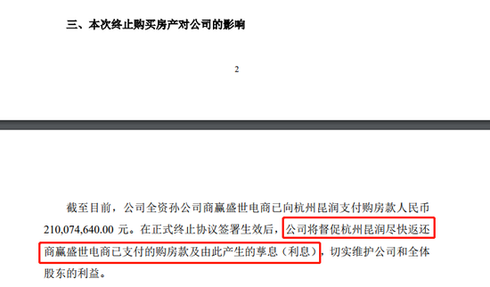 |  来源:董秘学苑   随着一波又一波的去杠杆,越来越多的上市公司暴露出资金链问题出现债务逾期,流动资金对于上市公司来说是一种底气的象征,但是却有一家上市公司上演“人傻钱多”,上一笔预付款还没有收回,这一次又出现向被“限制消费”人员买房的情况,最终房没买成,钱也没能拿回。   2018年2月,商赢环球公告基于对跨境电商行业前景的良好预期,公司决定在中国重要的电子商务中心杭州市购买商品房,协助旗下公司搭建线上销售和运营管理团队,打通旗下服装品牌在知名线上平台的销售渠道,进一步拓展品牌线上线下相结合的新零售业态。   交易的具体内容为:通过全资孙公司商赢盛世拟向杭州昆润房地产开发有限公司(以下简称“杭州昆润”)购买其所开发建设的昆仑商务中心第B幢第 5-12层,交易总对价约4.2亿元。   不过,最终,双方于2019年4月才达成初步交易,商赢盛世电商以2.1亿元向杭州昆润购买坐落于杭州市上城区昆仑商务中心2号楼5-8层的商品房共计16 套。商赢盛世电商已按《原协议》约定向杭州昆润支付的购房款2.1亿元(这个2.1亿元主要是此前2018年签署的协议预付的款项)。   本来一手交钱,一手交房,但是公司交完钱后,交易却并没有按照预期进行。因为,公司所购得商品房目前处于被抵押状态,无法完成过户,对方请求将交付期限延期至2020年1月5日,上市公司不同意,2019年7月9日,商赢环球董事会决议终止此次收购房产。   不过,对方并没有把钱还回来……,要知道,交易对方之所以房产未能申请解除抵押,就是因为借银行的钱没有还,如此上市公司的钱什么时候能追回来就不知道了。