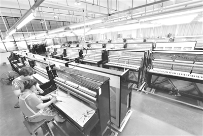 | 在德清县洛舍镇东衡村“钢琴小镇”产业园里,工人在组装钢琴。记者 魏培全 摄 | |