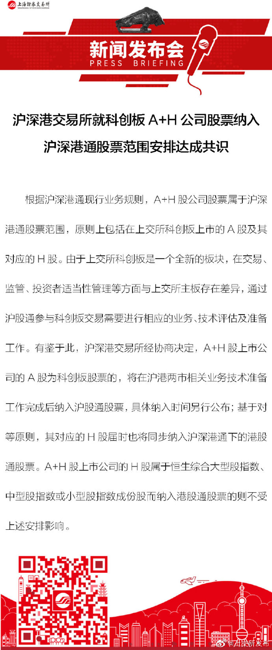 新浪财经讯 7月26日消息,上交所表示,沪深港交易所就科创板A+H公司股票纳入沪深港通股票范围安排达成共识。