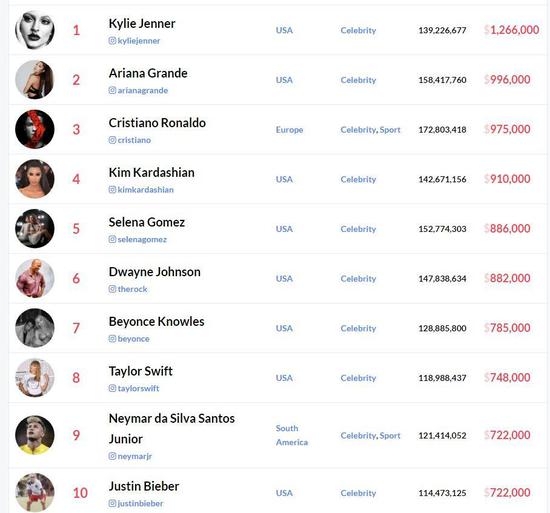 此外,金卡戴珊,Selena,巨石强森、内马尔、泰勒、比伯都在前十中。