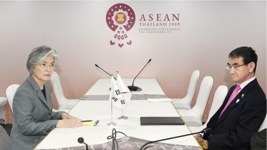 |  近一个月来的亚太局势颇不平静。   这不,同为美国盟友,日本和韩国也闹翻脸了。两国民众出现了敌视情绪,两国官员也互不待见。   有多不待见?看看这两天,在曼谷举行的东盟外长会期间,日本外相河野太郎、韩国外长康京和在会谈中的表情,就知道了。  图片来源:共同社、韩联社  正如上面的照片显示,为解决两国已持续一个月的贸易争端,8月1日,日韩两国外长举行了双边会谈;8月2日,在美国国务卿蓬佩奥(上图中间)协调下,又举行了三边会谈,可两次会谈都谈崩了。   结果,8月2日,日本经济产业大臣世耕弘成在东京召开记者会,宣布日本政府决定将韩国从可简化出口手续之“白名单国家”列表中移除,相关措施将于8月28日正式执行。   此前,于G20大阪峰会结束后,日本政府已于7月4日,实施第一轮对韩出口管制:限制用于制造芯片和液晶屏的3种半导体核心原料对韩国出口。   久不受人关注的日韩关系怎么恶化到这个地步?两国究竟因为了什么而争吵不已,互相指责?   纠纷   7月初,日本刚宣布对韩出口管制后,韩国政府立即召见日本大使进行外交抗议,说日本违背自由贸易的精神,准备在WTO起诉日本。   为免落人口实,日本辩解出一个“脑洞大开”的理由,说对韩国限供是出于国家安全考虑,因为担心这些半导体材料经过韩国流入朝鲜。   (朝鲜:关我什么事?)   其实,大家都心知肚明,日本这么做是因“2018年韩国二战劳工索赔案”对韩国进行报复。日本试图通过打击韩国科技产业,逼迫韩国政府改变其处理历史问题的态度。