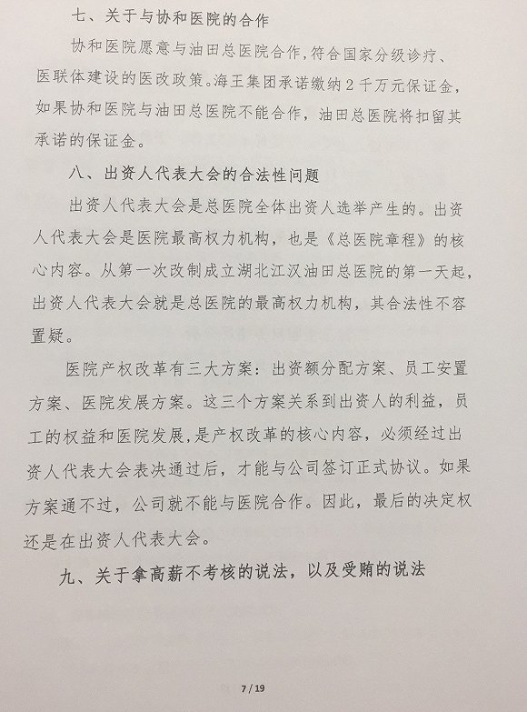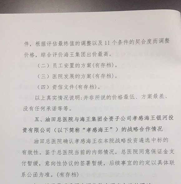 |   江汉油田总医院改制一事依然处于僵局。   8月12日界面新闻独家获悉,湖北江汉油田总医院产权改革领导小组方今日印发一份《关于我院产权改革有关情况的通报》(以下简称通报)的内部通报文件,对此前舆论关注的几大焦点问题进行了回应。但值得注意的是,产权改革领导小组方对此前已被海王生物(3.170, 0.02, 0.63%)与武汉协和医院否认的否认收购与托管一事再度进行了确认,使本次改制事宜再次充满疑云。   此前海王生物曾对此事公告称,根据江汉油田总医院意愿,孙公司孝感海王参与了江汉油田总医院战略投资者遴选,但仅仅是计划与医院进行战略合作,无权对医院现有管理体系进行改变,也不可能接管任何一家医院。目前的战略合作意愿仅处于商谈阶段,截止目前孝感海王没有缴纳收购保证金,没有对医院开展尽职调查,也没有签订战略合作意向协议。   不过通报中则称,“油田总医院确认孝感海王银河投资有限公司在本院战略投资遴选中标的有效性。鉴于总医院当前的内部情况,总医院同意保证金支付暂缓,意向性协议的签署暂缓,后续事宜的约定以具体联系公函为准。”   《关于我院产权改革有关情况的通报》文件部分截图   也就是说,虽然孝感海王目前仍未支付任何保证金,但产权改革领导小组依然确认此前结果有效。   尤为重要的是,上述通报中“关于海王生物公告的完整解读”称,海王生物公告说明的是目前的现状,公告没有说要放弃该项目,而是项目有进展就进行披露。   而海王生物此前却公告称,目前孝感海王仅参与了湖北江汉油田总医院战略投资者遴选,尚未开展尽职调查,目前对收购该医院没有实质性的计划。   海王生物证券事务代表谢德胜8月12日对界面新闻记者再次表达了上述公告内容,并且强调“海王生物目前对收购该医院没有实质性的计划”。   这显然与通报内容相悖。   对于另一焦点武汉协和医院是否会对油田总医院进行“托管”等合作,尽管此前武汉协和医院方面已否认上述说法,但上述通报依然表示“协和医院愿意与油田总医院合作,符合国家分级诊疗、医联体建设的医改政策。海王集团承诺缴纳2000万元保证金,如果协和医院与油田总医院不能合作,油田总医院将扣留其承诺的保证金。”   对于上述说法以及是否存在2000万元的协和医院合作保证金,谢德胜表示自己对此并不知情。   同时,通报还否认了海王生物承诺给予原管理层高薪不考核的说法,称谈判文件中明确提出要严格考核,但江汉油田总医院院长雷正秀则对界面新闻表示,海王生物确有给自己许诺过高薪,她同时还表示,海王生物方面此前曾告诉院方产权改革领导小组,收购后海王生物会给武汉协和医院20%的医院股份,让武汉协和医院成为油田总医院的二股东,这样油田总医院便“可以挂协和的牌子,以及更多实质性的帮助”。但直到遴选现场海王生物都没说清楚如何与协和合作。 |