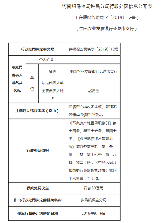 河南银保监局许昌分局决定对中国农业发展银行长葛市支行罚款30万元,尚广军被警告并罚款5万元。