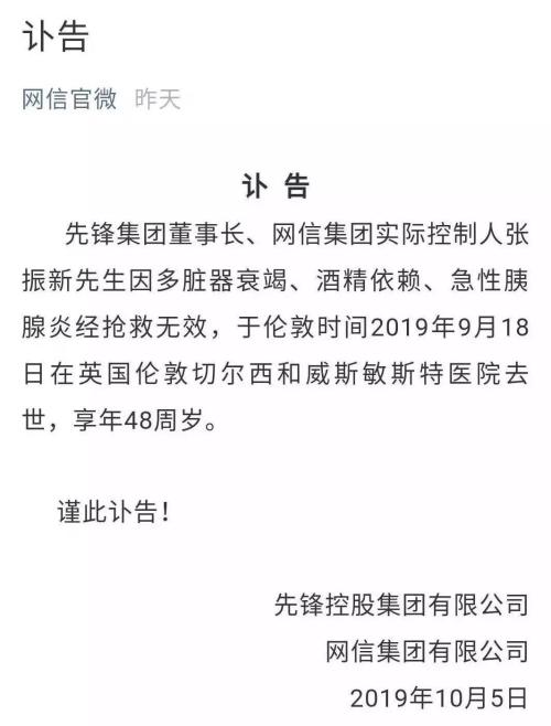 先锋控股与网信集团10月5日联合发布讣告,伦敦时间2019年9月18日,中国先锋金融集团有限公司(下称“先锋集团”)创始人张振新,因多脏器衰竭、酒精依赖、急性胰腺炎经抢救无效,在英国伦敦切尔西和威斯敏斯特医院去世,享年48周岁。