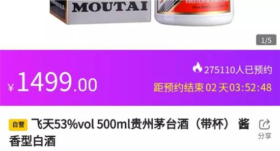 截至10月5日下午,已有超27万人上苏宁APP抢购预定1499元/瓶的飞天茅台。