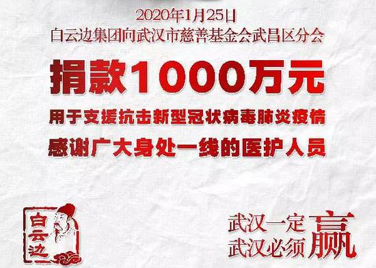 1月25日,白云边集团向武汉市慈善基金会武昌区分会捐款1000万元,用于支援抗击新型冠状病毒肺炎疫情。