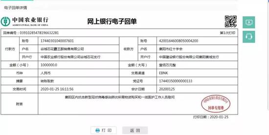 1月25日,湖北石花酒业通过襄阳市红十字会向襄阳定向捐赠人民币100万元,用于支援襄阳抗击新型冠状病毒肺炎疫情。据悉,这项捐赠将通过襄阳市红十字会账户,定向为襄阳各一线医疗机构采购防护服、护目镜、医用消毒液等急需的医疗防护物资。
