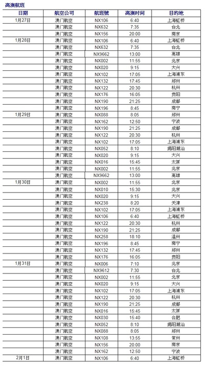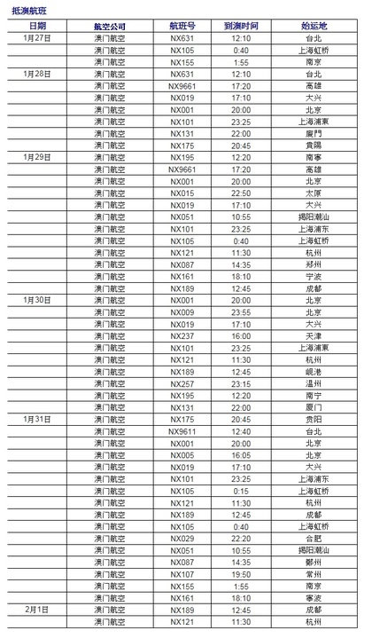 澳门航空27日发布消息称,1月27日至2月1日将取消逾百航班,主要涉及内地和台湾往返澳门的航线。