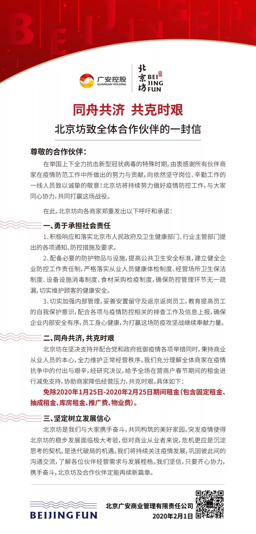北京坊目前正常营业不闭店,服务首都群众的物质文化生活。北京坊表示,充分理解全体商家在疫情抗争中的付出与艰辛,经北京广安控股集团有限公司领导班子集体研究讨论决定,对全场在营商户免除2020年1月25日至2020年2月25日期间租金(包含固定租金、抽成租金、库房租金、推广费、物业费),协助商家降低经营压力,共克时艰。