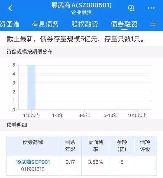 目前,公司存续一只超短融债券“19武商SCP001”,债券发行于2019年7月,规模5亿元,票面利率3.56%,将于今年4月14日到期。