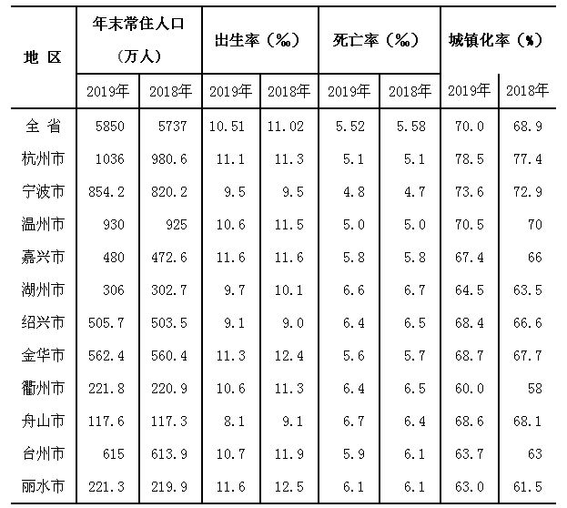 浙江省统计局发布的《2019年浙江省人口主要数据公报》显示,2019年末,全省常住人口为5850万人,与2018年末常住人口5737万人相比,增加113万人。数据显示,去年浙江自然增加人口为28.9万人。也就是说,去年浙江84.1万增量人口来自于机械增长即迁入人口。