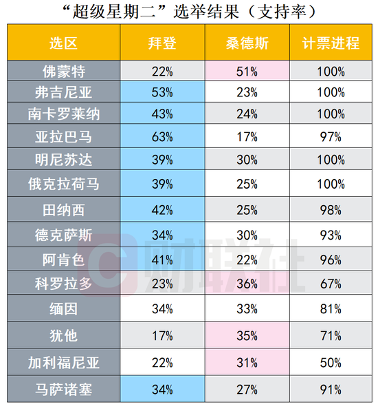 截至北京时间16点30分,在今日投票的本土十四州和美属萨摩亚中,民主党候选人拜登已经确定赢下九州、桑德斯确定赢下3州且在加州坐拥巨大优势。 双方在缅因州的选情仍处于胶着状态。