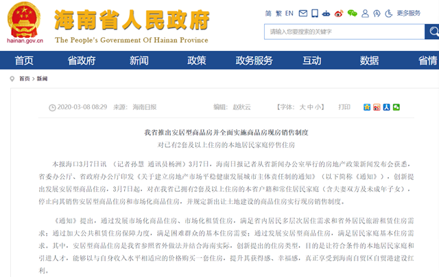 3月7日,海南省委办公厅、省政府办公厅发布的《关于建立房地产市场平稳健康发展城市主体责任制的通知》(下称《通知》)显示,自当日起,海南新出让土地建设的商品住房,实行现房销售制度。限购政策进一步加码,本省户籍和常住居民家庭禁止购买2套(不含)以上安居型商品住房和市场化商品住房。