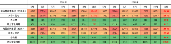 2019年,商品房销售面积171558万平方米,比上年下降0.1%,1—11月份为增长0.2%,上年为增长1.3%。其中,住宅销售面积增长1.5%,办公楼销售面积下降14.7%,商业营业用房销售面积下降15.0%。商品房销售额159725亿元,增长6.5%。