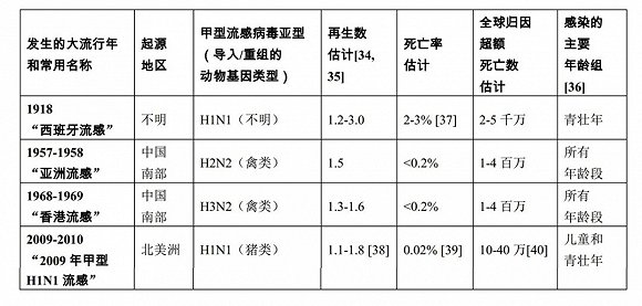 表:既往四次流感大流行的特点,源自WHO《流感大流行风险管理:指导和协调国家及国际流感大流行准备和应对的世界卫生组织指南》。