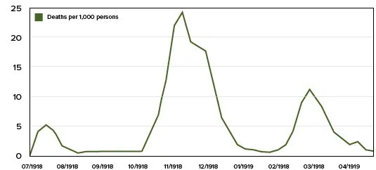 1918年的流感大流行又被称为“ 西班牙流感 ”。此次大流行共出现了三波疫情。第一波发生在1918年春季,第二波发生在1918年秋季,虽然是第二波,却是死亡率最高的一波疫情。到9月份,此次流感已经在欧美普遍传播,并迅速传到世界各地。第三波则发生于1919年冬季至1920年春季。1918年大流感最终感染了全世界大约三分之一的人口。在疫情流行最严重的六个月内,约有五千万人死亡;有些研究估算全世界在此次大流行中的因流感死亡的人数超过该数字的两倍。印度大约有1700万人死亡,美国大约有67万5千人死亡,英国则有 20万人死亡。