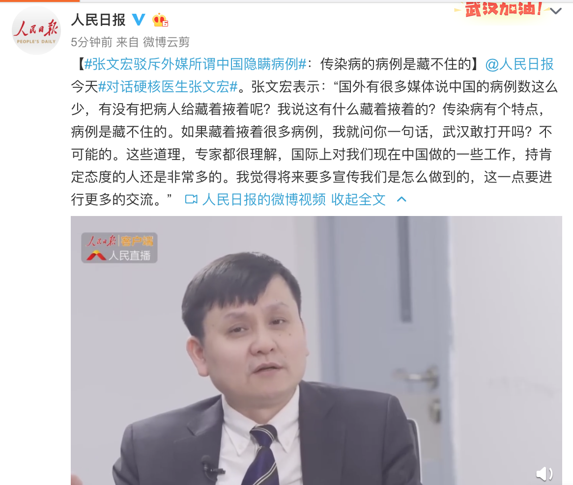4月11日,张文宏接受人民日报采访时,驳斥了外媒所谓中国隐瞒病例的说法,称传染病的病例是藏不住的。