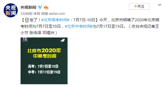 今天,北京市明确了2020年北京高考时间为7月7日至10日,北京中考时间为7月17日至19日。(总台央视记者王小节 张伟泽 邓煜洲)