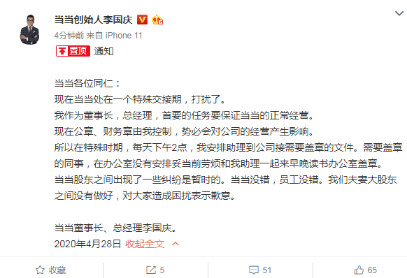 当当股东之间出现了一些纠纷是暂时的。当当没错,员工没错。我们夫妻大股东之间没有做好,对大家造成困扰表示歉意。